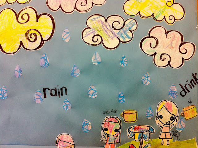 Although the children have memorized it and repeat it daily, it occurred to me that they may not even understand what they are saying. Is their English level high enough to visualize what the poem is describing? Since I was unsure, I decided to embark on a project for the entire class to work on. Over the span of a week and a half we made a large mural that depicted the poem they had learned. I hoped the finished project would help with their understanding of English and the vocabulary they have learned.
